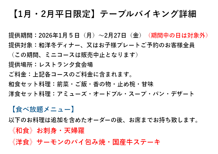 【2026年1月・2月平日限定】ディナーテーブルバイキング開催決定! new