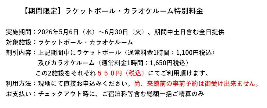 【期間限定】ラケットボール・カラオケ特別料金のご案内 new